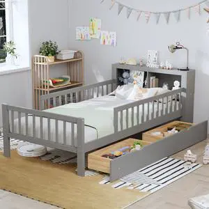 Twin Size Bed with Headboard Storage Rack, Two Under-Bed Drawers, Three-Side Guardrails for Safety and Security,Gray