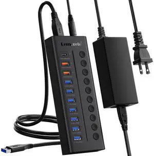 Lemorele 72W Powered USB Hub - 10-Port Splitter Hub (7 Data Transfer + 1 Smart USB Charging + 2 USB C Charging) with Individual LED On/Off Switches, USB 3.0 Hub, for Mac, PC & More