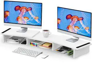 LORYERGO Dual Monitor Stand for 2 Monitors, Desk Riser With Storage, Computer Stand w/Slot for Tablet Cellphone, for PC, Laptop, Printer
