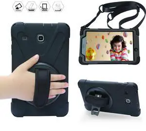 BRAECN for Galaxy Tab E 8.0 Case,360 Degree Rotation Stand/Hand Strap and Shoulder Strap Case [Shock Proof] Hybrid pc+Silicone Cover for Samsung Tab E 8'' SM-T375/ SM-T377/ SM-T378 (Black)