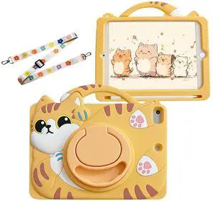 SINQERISHT Tablet Case for Galaxy Tab A9 8.7 inch 2023(SM-X110/X115/X117) Cover with 360 Swivel Stand/Handle Grip/Shoulder Strap,Shockproof Silicone Cover 3D Lovely Cat Case(Orange Yellow)