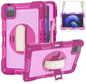 YOUULAR Tablet Case for Xiaomi Pad 6 Pro/Xiaomi Pad 6 23043RP34C, 23043RP34G 11.0 inch, Tablet Shockproof Cover with 360 Rotating Stand and Wrist Strap, Shoulder Strap Red Rose+Pink