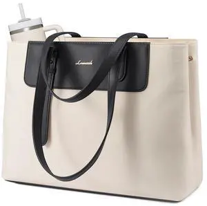 LOVEVOOK Laptop Tote Bag for Women 15.6 Inch, Water-Resistant Work Tote Bag Large Capacity Computer Bag Briefcase Handbag for Office Business Travel Teacher Nurse, Nylon & PU, Beige