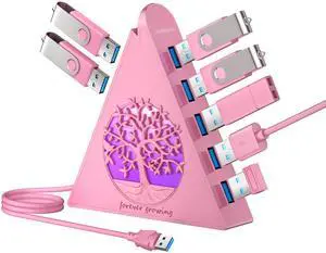 JoyReken 7-Port USB 3.0 Hub, RGB USB Hub with RGB Tree Light and 2ft Cable, USB Hub 3.0 Pink USB Expander for Laptop, PC, Flash Drive, HDD, Console, Printer, Keyboard, Mouse (Pink)