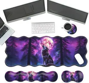 4-in-1 XXL Gaming Mouse Pad Set (31.5"x11.8") with Keyboard Wrist Rest,Mouse Wrist Support & Coaster,Non-Slip Desk Mat for OfficeHomeGaming,Moon Wolf Howling