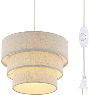 Bobobigo Plug in Pendant Light, Hanging Lamp with Dimmable Switch, Pendant Light Fixtures with 15 Ft Cord, Swag Light with Linen Fabric Shade for Bedroom, Kitchen, Living Room, Dining Table