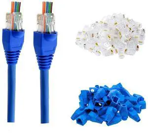 PETECHTOOL RJ45 Cat6 Pass Through Connectors Gold Plated 8P8C Ends and Blue Strain Relief Boots for CAT6 RJ45 Ethernet Network Cable Connector Plug Cover 100/100 (200 Packs Total)