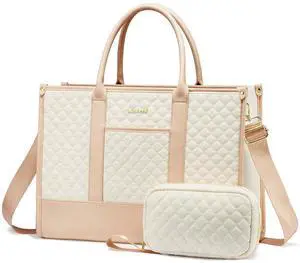 LOVEVOOK Laptop Bags for Women, 15.6 inch Waterproof Work Tote Bag with Clutch, Professional Teacher Computer Purse Lightweight Shoulder Bag Travel, Quilted Beige & Brown