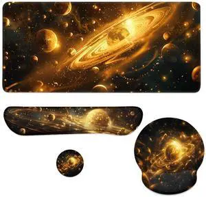 Golden Galaxy Mouse Pad Set Shining Planetary Rings Sun Gaming Mousepad 4in1 Desk Mat for Desktop Wrist Support Cup Coaster Set Ergonomic Computer Desk Arm Wrist for Decor Home Office