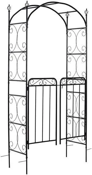 84" Garden Arch Arbor with Gate, Metal Arch Trellis, Garden Archway for Climbing Vines, Wedding Ceremony Decoration, Flourishes & Arrow Tips, Black