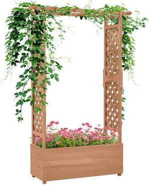Raised Garden Bed with Arch Trellis for Vine Climbing Plants, Hanging Flowers, 70.75" Tall Outdoor Wood Planter Box with Drainage Hole & Fabric Filter for Backyard, Patio, Brown