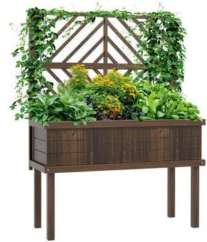 Raised Garden Bed with Trellis for Climbing Plants, Vegetable, Grape Vines, Wood Planter with Legs, Drainage Holes and Filter for Outdoor Garden, Patio, Carbonized