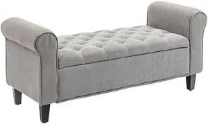 50" Storage Ottoman Bench, Upholstered End of Bed Bench with Rolled Arms, Wood Legs, Button Tufted Storage Bench with Safety Hinges for Living Room, Entryway, Bedroom, Gray