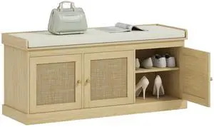 Shoe Storage Bench with Woven Rattan, Shoe Bench with Cushion, Adjustable Shelves, Entryway Bench for Bedroom, Living Room, Oak Tone