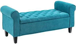 50" Storage Ottoman Bench, Upholstered End of Bed Bench with Rolled Arms, Wood Legs, Button Tufted Storage Bench with Safety Hinges for Living Room, Entryway, Bedroom, Teal