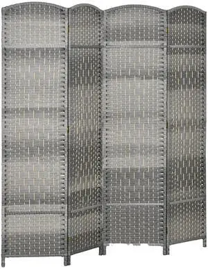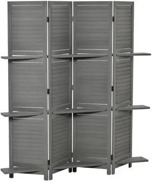 4-Panel Folding Room Divider, 5.6 Ft Freestanding Paulownia Wood Privacy Screen Panel with Storage Shelves for Bedroom or Office, Gray