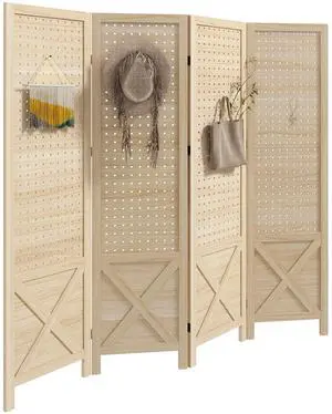 4 Panel Pegboard Display Room Divider, 4.7' Tall Wood Indoor Portable Folding Privacy Screen, Partition Wall Divider for Home Office, Natural