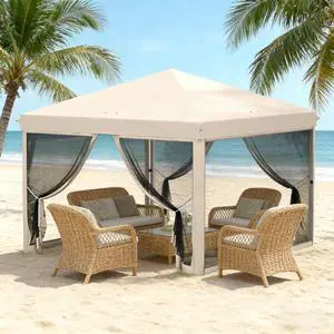 6-Sided Hexagon Pop Up Party Tent Gazebo with Mesh Netting Walls & Shaded Interior, 12' x 12', Beige