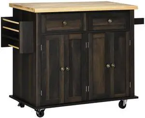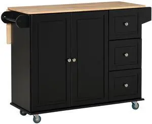 Kitchen Island on Wheels, Rolling Cart with Rubberwood Top, Spice Rack, Towel Rack and Drawers for Dining Room, Black