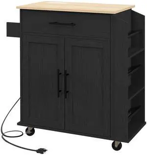 Kitchen Island with Storage, Rolling Kitchen Cart with AC Outlets and USB Ports, Microwave Stand with Towel and Spice Rack, Black