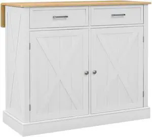 Rolling Kitchen Island with Drop Leaf Wood Breakfast Bar, Farmhouse Kitchen Cart with 2 Drawers, Adjustable Shelves for Dining Room, White