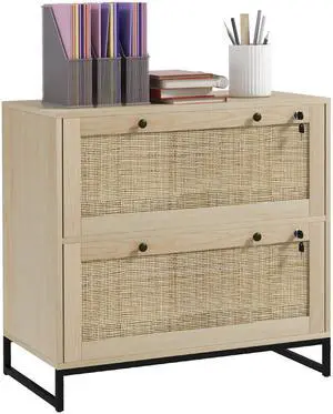 2 Drawer File Cabinet with Lock, Vertical Filing Cabinet with Keys, Rattan Drawers and Adjustable Hanging Bar for Letter, A4 and Legal Size Paper, Natural