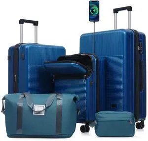 Hardside Luggage Set 5 Piece with Bags,20IN Half-opening Carry on Luggage with USB Port, Expandable 24IN 28IN Luggage with Double Spinner Wheels TSA Lock