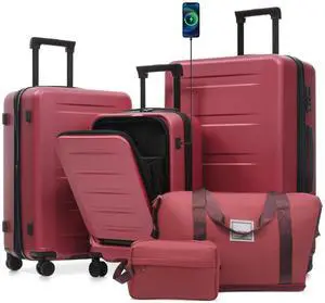 Luggage Sets 5 Piece with Front Opening , Hardside Expandable Carry on Suitcase with Spinner Wheels TSA Lock USB Port Cup Holder Duffel Bag and Toiletry Bag