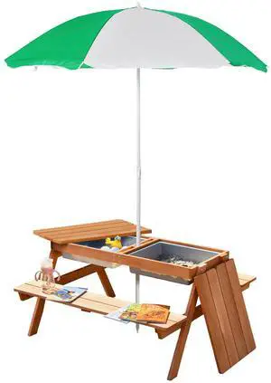 Kids Picnic Table with Umbrella and Storage Inside, Sand and Water Table, Kids Outdoor Furniture, Wooden Bench Backyard Furniture for Garden, Patio, or Balcony