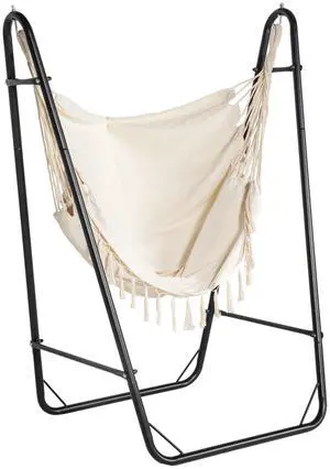 Patio Hammock Chair with U Shape Stand, Outdoor Hammock Swing Hanging Lounge Chair with Side Pocket, Black/Cream White