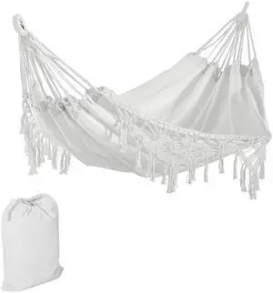 Extra Large Boho Hammock with Macrame Tassel Fringe, Includes Carrying Bag, Indoor Outdoor Tree Hammock for Porch, Backyard, Camping, White