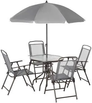 6 Piece Patio Dining Set for 4 with Umbrella, Outdoor Table and Chairs with 4 Folding Dining Chairs & Round Glass Table for Garden, Backyard and Poolside, Gray