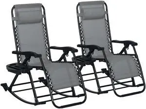 2 Pieces Outdoor Rocking Chairs, Foldable Reclining Zero Gravity Lounge Rocker with Pillow, Cup & Phone Holder, Combo Design with Folding Legs, Gray