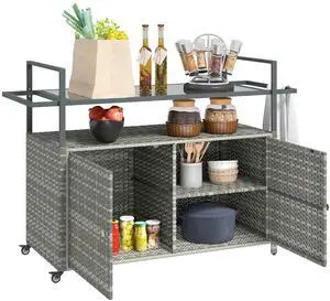 Wicker Outdoor Bar Table with 2-Tier Shelf & Cabinet, Mixed Gray