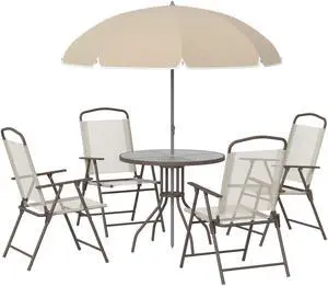 6 Piece Patio Dining Set for 4 with Umbrella, Outdoor Table and Chairs with 4 Folding Dining Chairs & Round Glass Table for Garden, Backyard and Poolside, Beige