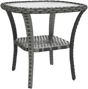 Rattan Coffee Table with Storage Shelf, Wicker Side Table with Glass Top, Outdoor End Table for Garden, Porch, Backyard, Mix Gray