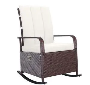 Wicker Outdoor Rocking Chair, Patio Recliner with Adjustment Backrest, PE Rattan Lounge Chair with Adjustable Footrest and Cushions for Garden, Backyard, Porch, Beige