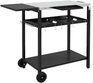 Outdoor Bar Cart with Stainless Steel Tabletop, Kitchen Island with Wheels, 2 Tiers & Seasoning Shelf, Patio Serving Cart with Hooks, Towel & Garbage Bag Holder, Plates & Spice Jars, Black