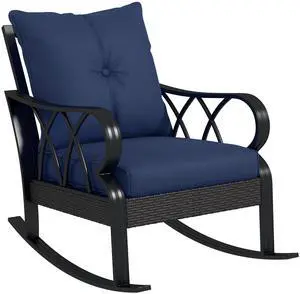 Outdoor Wicker Rocking Chair with Padded Cushions, Aluminum Furniture Rattan Porch Rocker Chair w/ Armrest for Garden, Patio, and Backyard, Navy Blue