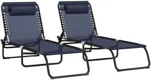 Folding Chaise Lounge Pool Chair Set of 2, Patio Sun Tanning Chair, Outdoor Lounge Chair w/ Reclining Back, Pillow, Breathable Mesh & Bungee Seat for Beach, Dark Blue