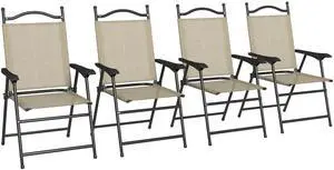 Folding Patio Chairs, Set of 4 Sports Chairs for Adults, Camping Chairs with Armrests, Breathable Mesh Fabric Seat for Lawn, Beige