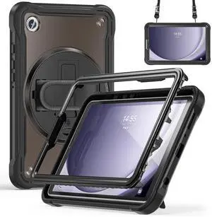 GooodiDEAR Shockproof Case for Samsung Galaxy Tab A9 8.7" 2023, Heavy Duty Cover with Pen Slot Shoulder Strap, 360deg Rotating Strap, Multi-Angle Stand, Slim Hybrid Protector, SM-X110/X115/X117, Black
