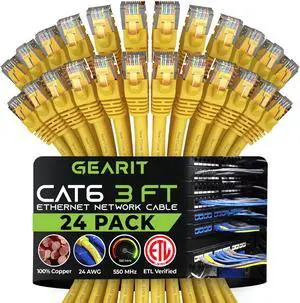 GearIT Cat 6 Ethernet Cable (24-Pack 3 Feet) Cat6 Network Patch, 10Gbps, RJ45, Snagless Cord, Gold-Plated Connectors, Internet for PC, TV, Tablet, Router, Printer, Servers, IT Data Center - Yellow