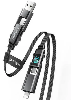 4 in 1 Charging Cable 5FT 60W USB C to USB C Cable Fast Charging Flat Braided iPhone Charger Cord Combo USB A/C to C/L with LED Display Type C Charging Cord for iPhone 16/15 MacBook iPad