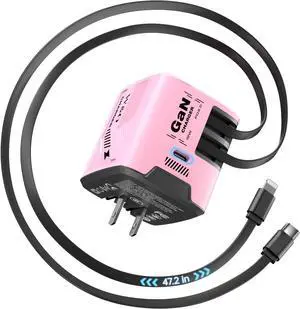 Fast Charger for iPhone17/16/15 60W gan Charger Retractable Phone Charger Wall Plug with Lightening and Type-C Cables for iPhone Galaxy S25/24 Android and More (Pink)