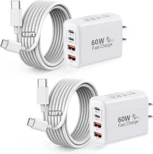 iPhone 17/16/15 Charger 2Pack 60W Multiport USB C Charging Block 4-Port Charge Adapter iPhone Charger with 10FT USB C to C Fast Charging Cable Cord for iPhone17 Pro Max/17e/16e/16Pro/15Plus iPad