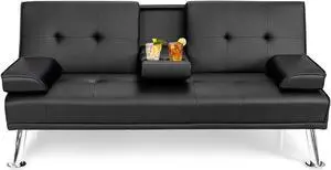Costway Convertible Folding Futon Sofa Bed Leather w/Cup Holders&Armrests Black