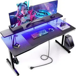 DIXSG 55" Ergonomic Carbon Fiber Gaming Computer with Monitor Stand, Power Outlet & RGB Mouse Pad, Black