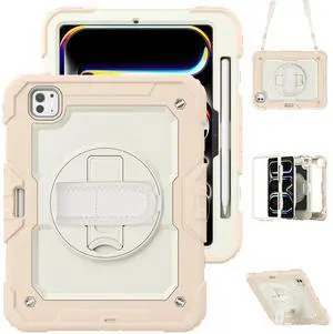 Dteck for iPad Pro 11 inch (M4/M5) 2024/2025 Release Shockproof Case with Screen Protector/Stylus Pencil Holder/Rotating Kickstand/Grip Hand Strap, Heavy Duty Protective Rugged Tablet Cover, Pink