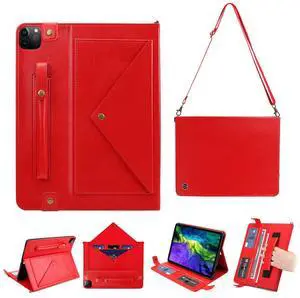 Dteck for iPad Pro 13" M4/M5 Multifunctional Folio Case with Shoulder Strap, Multi Card Slots/Pockets, Built-in Pencil Holder, Stand, Button Closure, PU Leather Protective Briefcase Design Case, Red